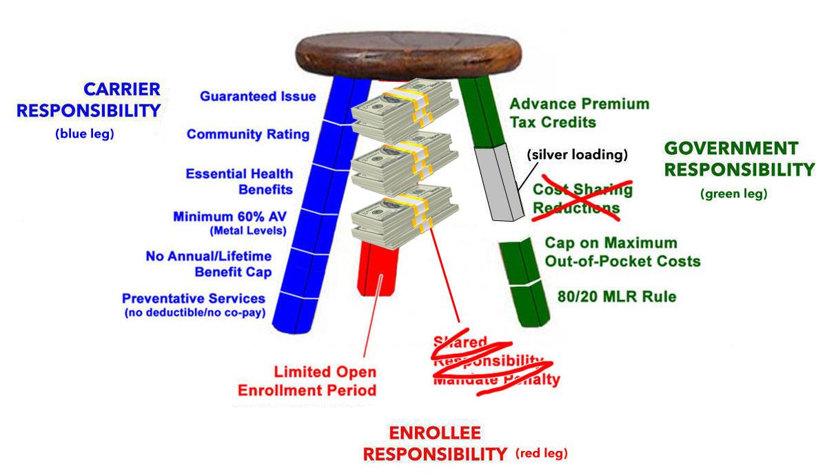 Once again, let's look at the ACA's 3-Legged Stool, which effectively now has only two legs plus the World's Most Expensive Shim® now that Congressional Republicans have repealed the individual mandate penalty: