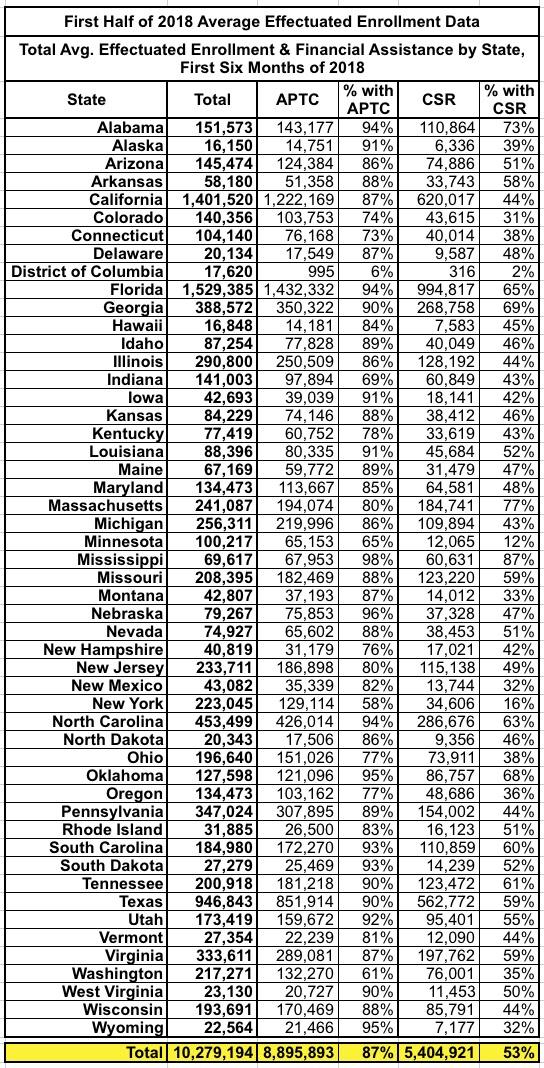Here's last year's report: For the first 6 months of 2017, 10,142,056 people were enrolled in effectuated ACA exchange policies nationally on average each month. By comparison, this year it's 10,279,194 people...or just over 1% higher, as noted above.