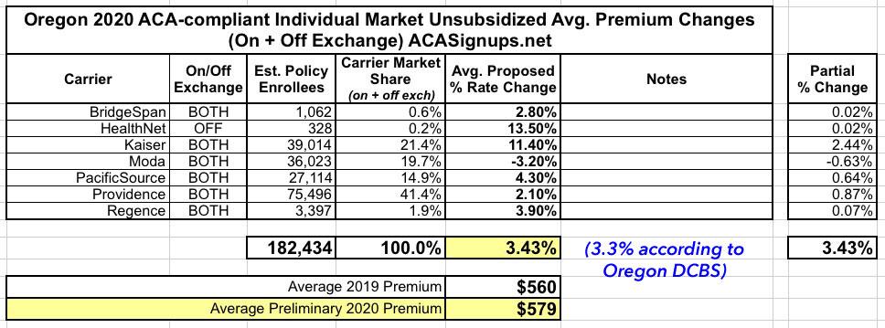 Oregon: PRELIMINARY 2020 ACA Exchange Premium Rate Changes: 3.3% increase