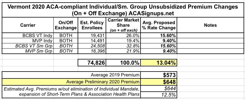In any event, the Vermont Green Mountain Care Board has issued a press release for preliminary rate filings for the 2020 Open Enrollment Period, and I'm afraid both BCBS and MVP are looking to spike prices quite a bit more than they did this year.