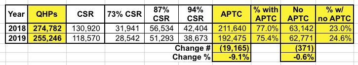 • First, this doesn't include off-exchange enrollment. In Q1 2018, they had around 89,000 effectuated off-exchange QHP enrollees. If the Q1 2019 off-exchange number also drops significantly, then the odds are that the reinstated mandate penalty went either unknown or unheeded. If it holds close to 89K, on the other hand, that suggests that a decent number of unsubsidized enrollees did enroll (grudgingly, perhaps) due to the mandate still being around. You'd really have to compare this with the off-exchange impact in other states as well, however.