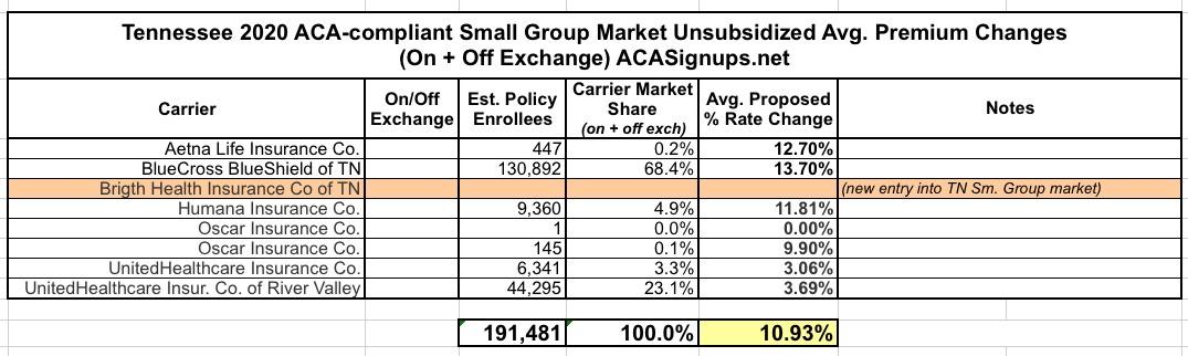 - BlueCross BlueShield of Tennessee: Expanding coverage into Nashville, Memphis and surrounding counties. Proposed 2020 rate request seeking an average increase of 1.4%.