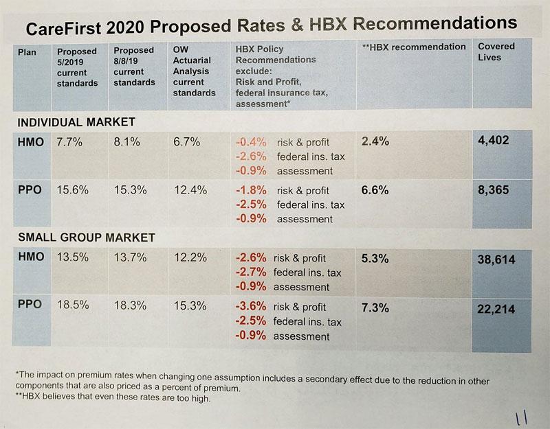 I'm not sure what to make of some of this...it looks like the August 8th percentages are the revised requested changes from the carriers. The HBX recommendation is obvious, although I'm not sure why they need to "recommend" those numbers if they're the ones who vote on the final rate approval (perhaps there's one part of the DC exchange board which makes the recommendations and another part which votes on them?)