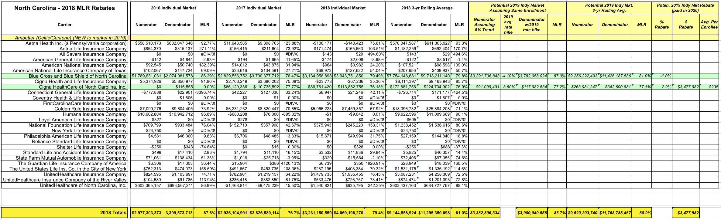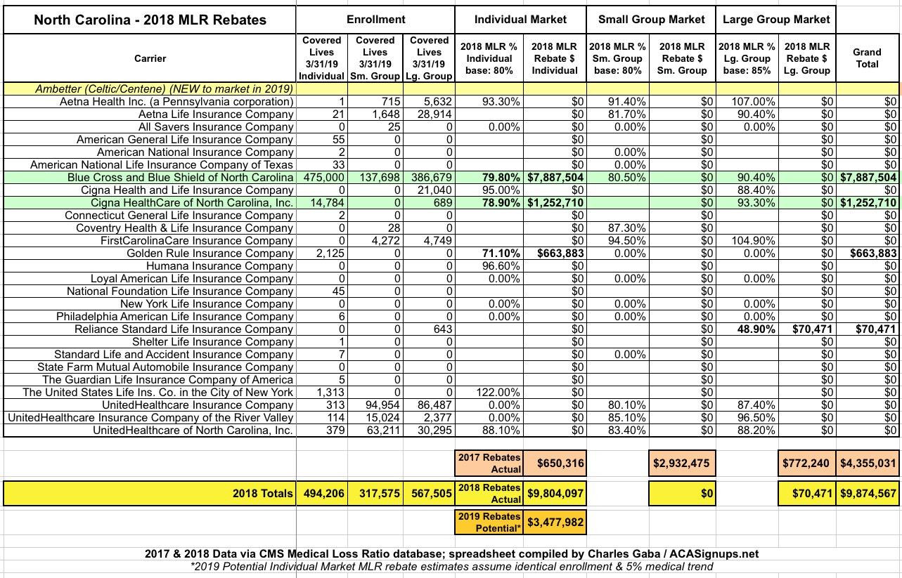 Exclusive! North Carolina: 2018 MLR Rebate Payments (& potential 2019 rebates)