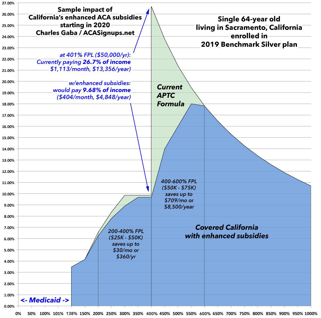 Under the ACA, if our 64-year old earns less than- $49,960/year, they won't have to pay any more than about 9.8% of that, or around $4,900. If they go even $1 over that, however, they lose all subsidies and their cost skyrockets to the full $13,356. With California's enhanced subsidies, starting in 2020, this would drop back down to under 10% of their income, for a whopping 63% cost reduction, saving them over $8,500 for the year.