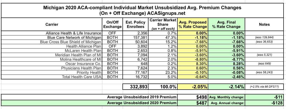 The Michigan Dept. of Insurance & Financial Services issued a press release and the following report, which includes the official (still preliminary) 2020 rate filings for both the Individual and Small Group markets (click the image for a higher-res version):