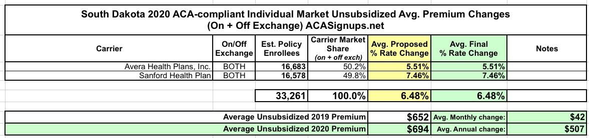 South Dakota: *Final* avg. unsubsidized 2020 #ACA premium changes: 6.5% increase
