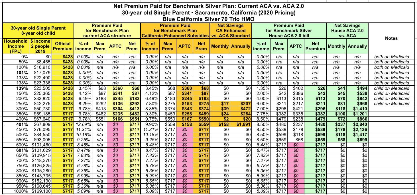 With that in mind, I've whipped up several examples showing how different California households will fare compared to the official ACA subsidy structure for 2020. It's important to keep in mind that all of these assume they're enrolling in the benchmark Silver plan. If they go for a Bronze, Gold, Platinum or different Silver, things will look a bit different as well.