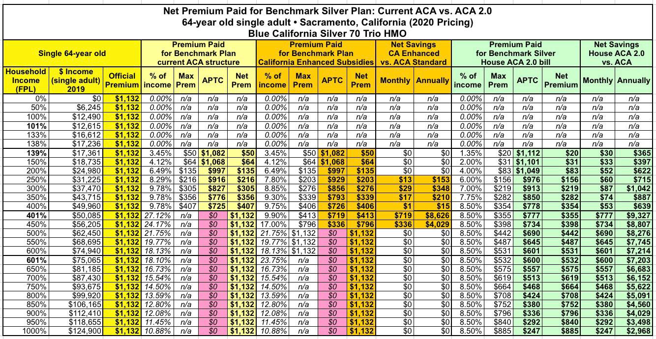 Under the official ACA structure, the total cost for both would be limited to no more than between $68 and $551/month between 138 - 400% FPL...after which it would immediately jump to the full $717/mo, or over $8,600/year. Under California's expanded subsidies, however, they'd receive additional savings of as much as $472/year between 250 - 400% FPL...and as much as $1,891 between 400-450%.