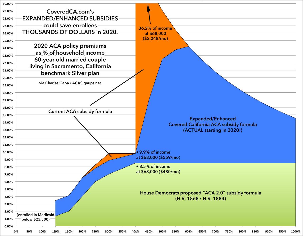Until now, only CoveredCA enrollees earning 138-400% of the Federal Poverty Line were eligible for ACA financial assistance. Starting in 2020, however, enrollees earning 400-600% FPL may be eligible as well (around $50K - $75K/year if you're single, or $100K - $150K for a family of four). In addition, those earning 200-400% FPL will see their ACA subsidies enhanced a bit.
