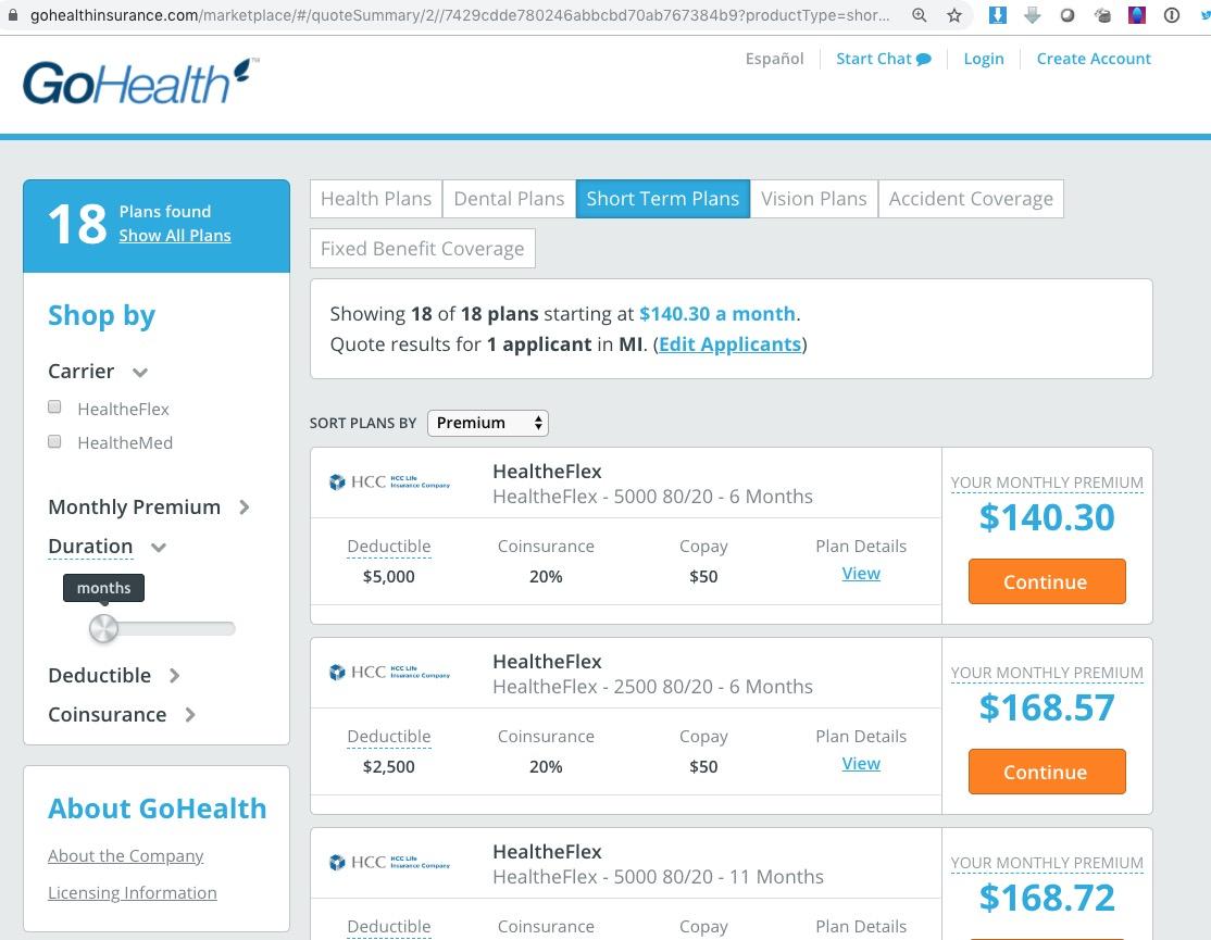 ...and when you click on one the "Short-Term Plan" link, you're of course given a list of policies from insurance carriers most people have never heard of, offering plans which on the surface appear to be much less expensive: