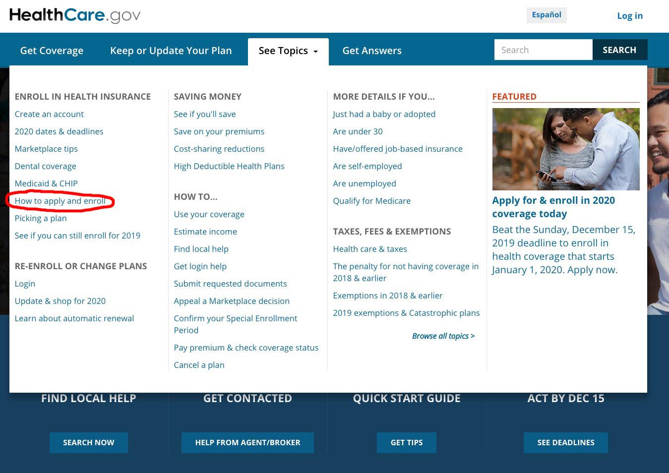 If you visit HealthCare.Gov and roll over the "See Topics" tab, you'll see "How to Apply and Enroll"...