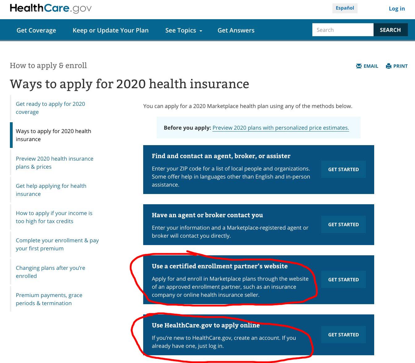 It's not until the fourth option--which may not even fit on the screen depending on your browser window size--that you see what should be listed first or at least second: "Use HealthCare.Gov to apply online". This is already concerning...they're promoting 3rd-party "partner" sites over the actual, official website you're already on to begin with.