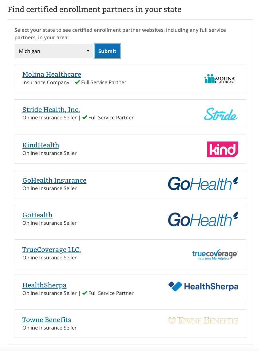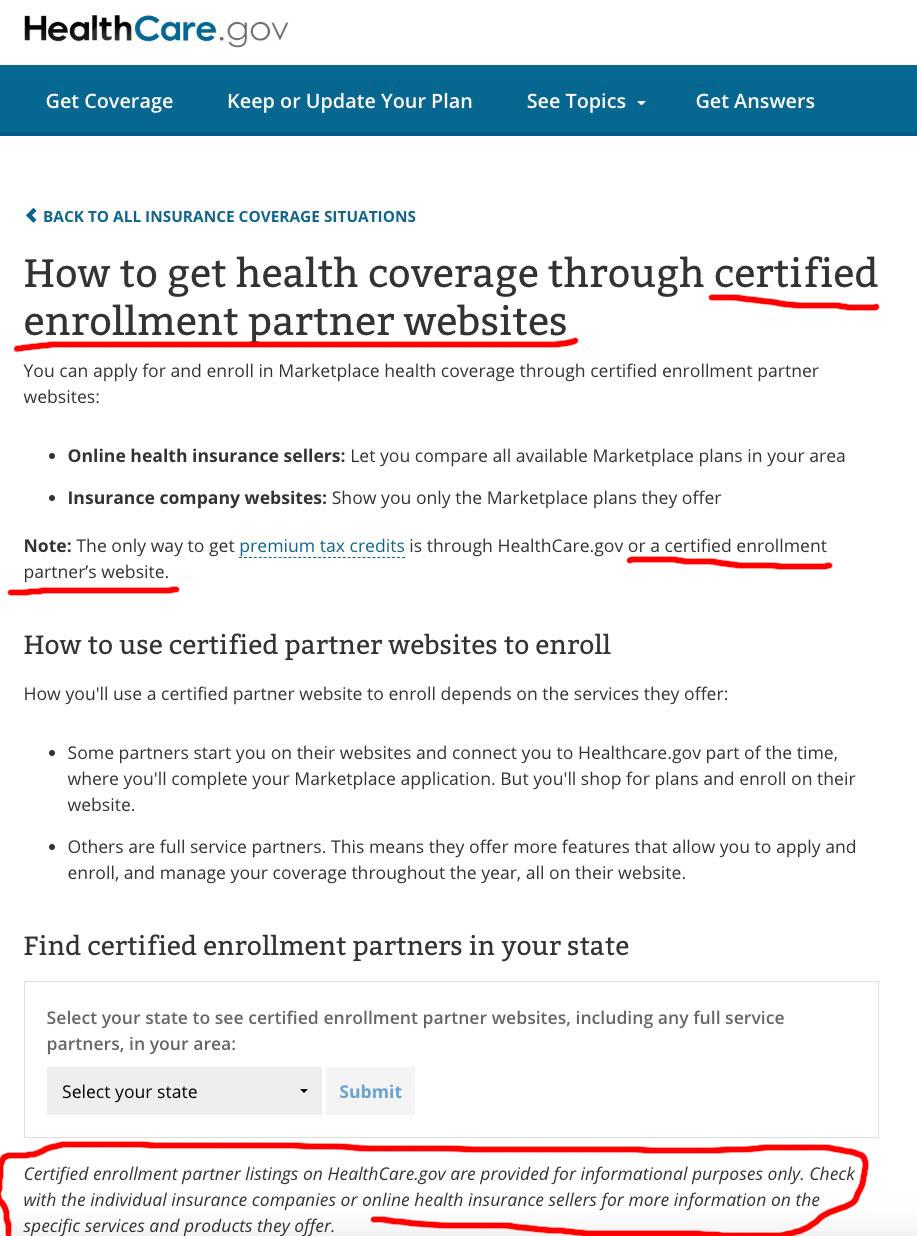 When you click on "Certified enrollment partner sites", you're taken to this screen. To be fair, it does provide the caveat that these are indeed 3rd-party sites...but it still muddies the water quite a bit for those who aren't familiar with all the nuances and details of how either the ACA or website links work: