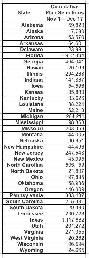 This Open Enrollment snapshot covers the period from December 8, 2019, to 11:59PM Eastern Time on December 17, 2019. The plan selections reported in this snapshot are not final and do not include plan selections for consumers who enrolled in coverage between 12:00AM and 3:00AM ET on December 18, 2019, or consumers who left their contact information at the call center due to high volume. Similar to previous years, the Centers for Medicare & Medicaid Services (CMS) plans to release an updated snapshot during the second week of January with the final enrollment data.