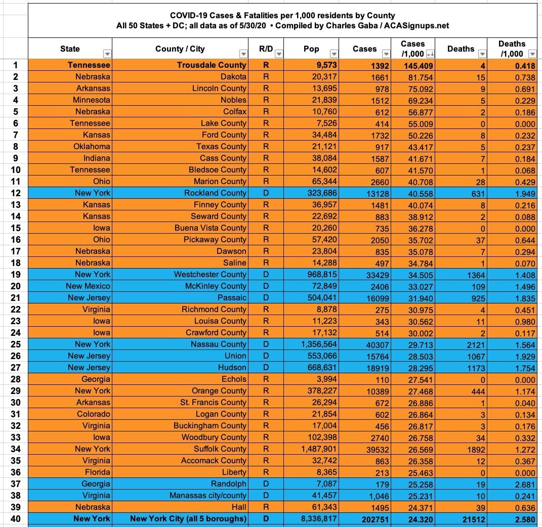Here's the 40 counties with the highest official per capita rates of COVID-19 cases and fatalities as of Saturday, May 30th: