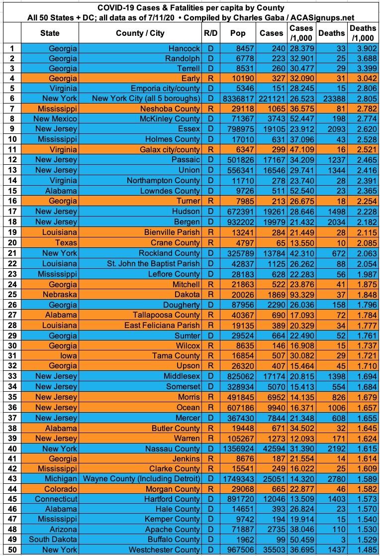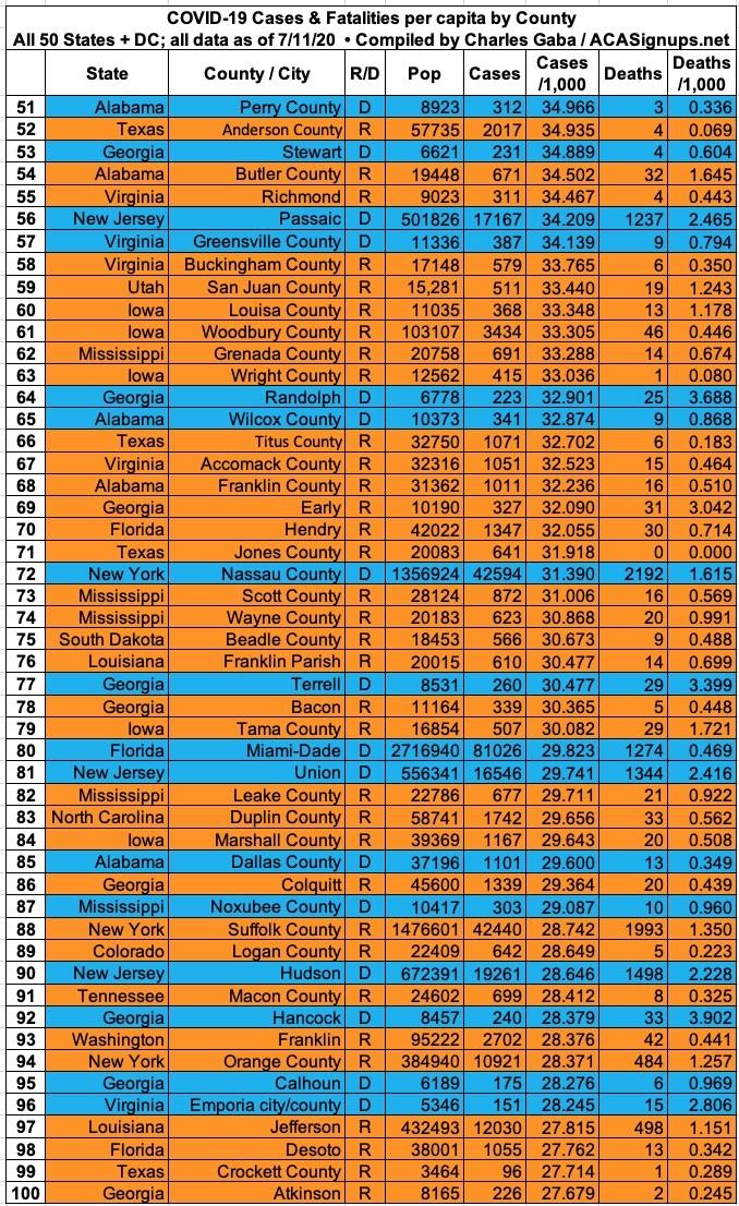 Here's the top 100 counties ranked by per capita COVID-19 fatalities as of Saturday, July 18th (click image for high-res version):