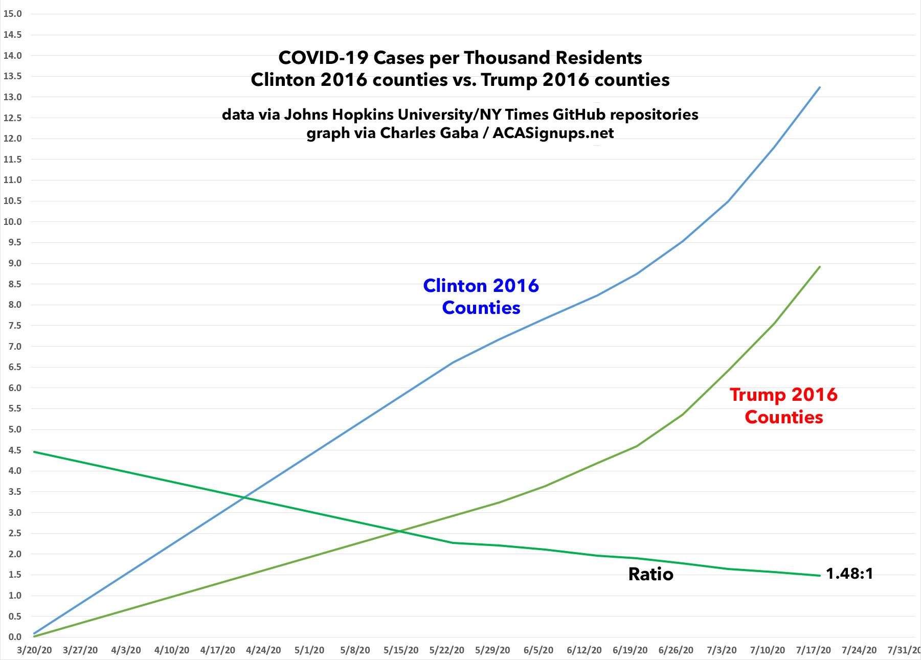 It's also worth noting how the ratio of per capita cases has shifted between the Clinton and Trump counties over time. Back in mid-March, the rate was 4.5x higher in Clinton-voting counties than Trump counties. As of this weekend that ratio was down to 1.6x. In terms of the mortality rate, the ratio has dropped from 5.3x to 2.7x.