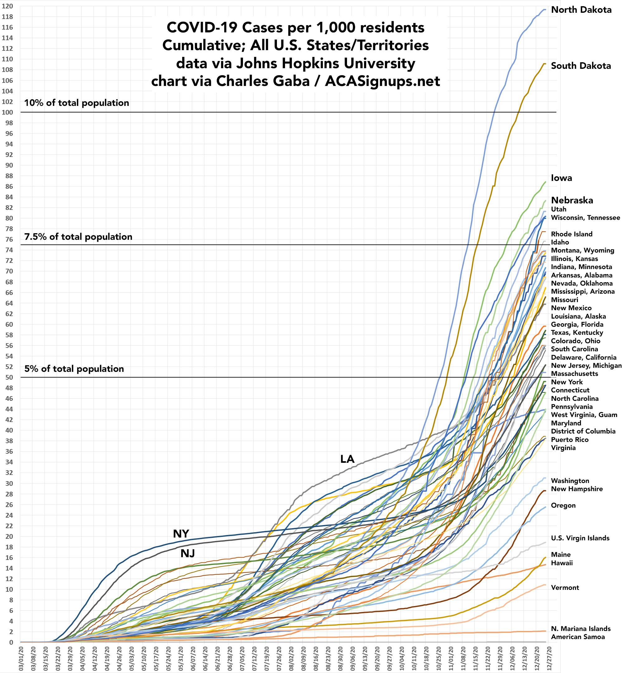 North and South Dakota are the first two states where more than 10% of the entire population has tested positive (in fact, North Dakota is about to hit 12%). A few other states could all potentially hit the 10% milestone by New Year's Eve as well.