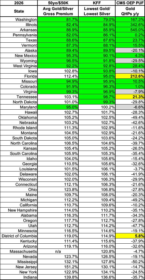 In my last big posts about Premium Alignment, I explained the basics of how it works and then concluded that there were around a dozen states which had Premium Alignment pricing in place this year (3 of which--Arkansas, Illinois and Washington State--are newly implementing this pricing policy starting in 2026 specifically in response to the federal tax credits expiring). The 14 states I came up with included AK, AR, CO, IL, MD, MO, NM, PA, TX, VT, VA, WA, WV & WY, with some states pushing the adjustment factor harder than others.