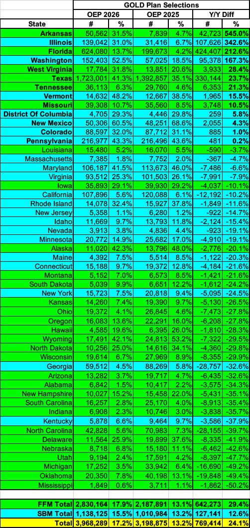 So, what's the deal with those ~770K who upgraded? Well, that's where Silver Loading & Premium Alignment once again come to the rescue. But first, let's take a look at the data. Here's 2026 Open Enrollment Period GOLD plan selections by state, sorted by how much they increased or decreased year over year on a percentage basis: