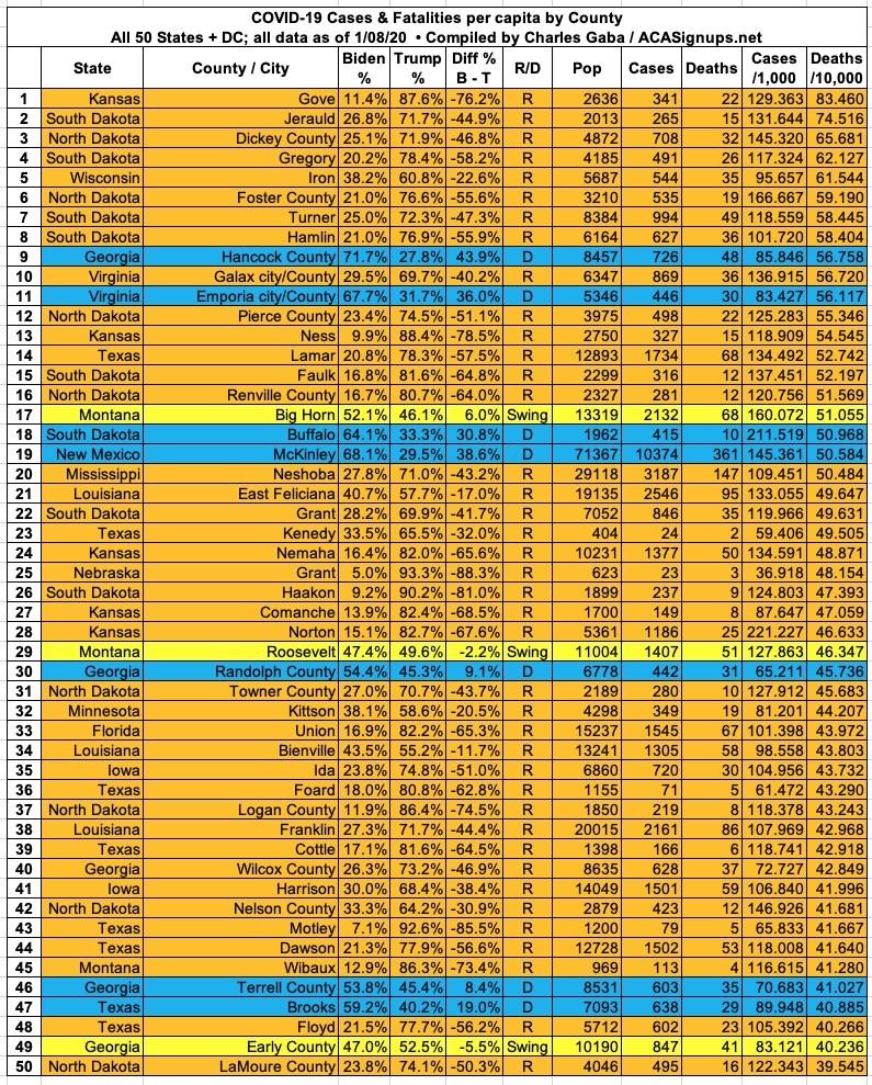 Here's the top 100 counties ranked by per capita COVID-19 fatalities as of Friday, January 8th, 2021 (click image for high-res version):