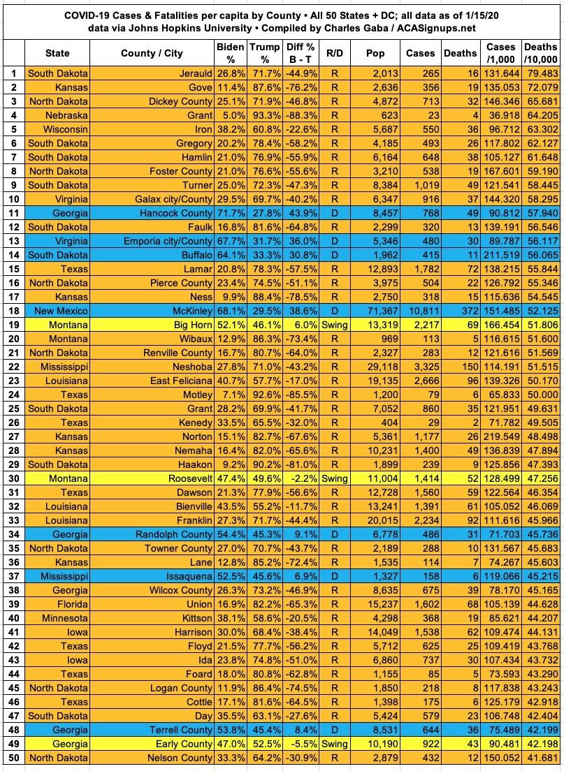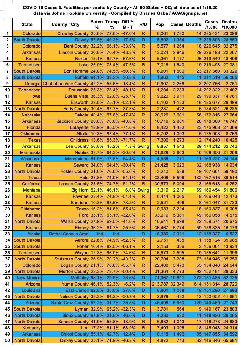 Here's the top 100 counties ranked by per capita COVID-19 fatalities as of Friday, January 15th, 2021 (click image for high-res version):
