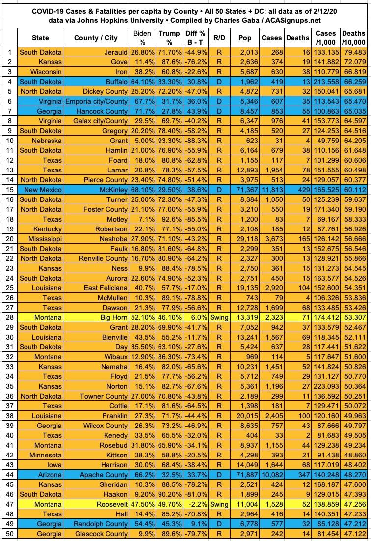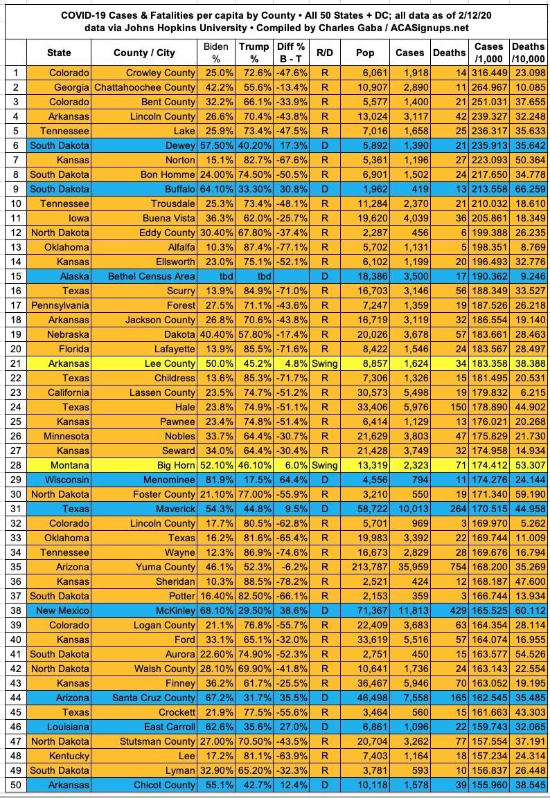 Here's the top 100 counties ranked by per capita COVID-19 fatalities as of Friday, February 12th, 2021 (click image for high-res version):