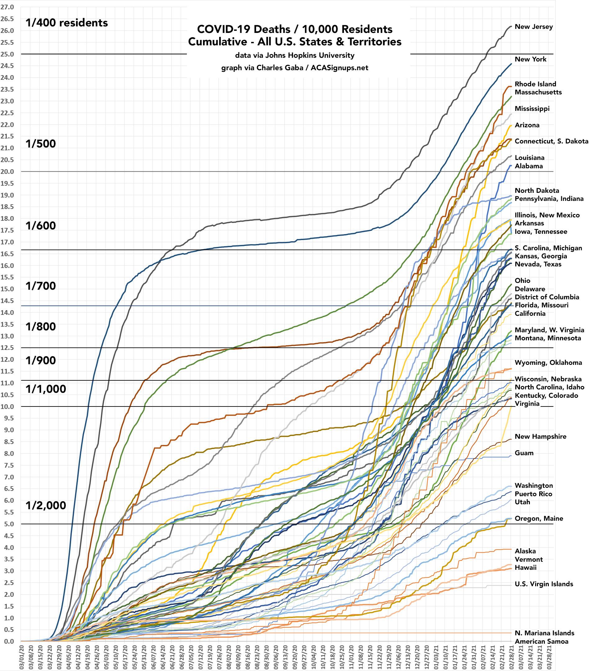 Next, let's look at the cumulative mortality rate for every U.S. state and territory. Here, New Jersey and New York are still worse than the rest of the country (primarily due to their mass deaths from March - May last spring)...but as you can see, several other states are, tragically, also catching up to them on this front as well.