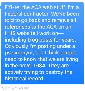 "FYI-re: the ACA web stuff. I'm a federal contractor. We've been told to go back and remove all references to the ACA on an HHS website I work on--including blog posts for years. Obviously I'm posting under a pseudonym, but I think people need to know that we are living in the novel 1984. They are actively trying to destroy the historical record."