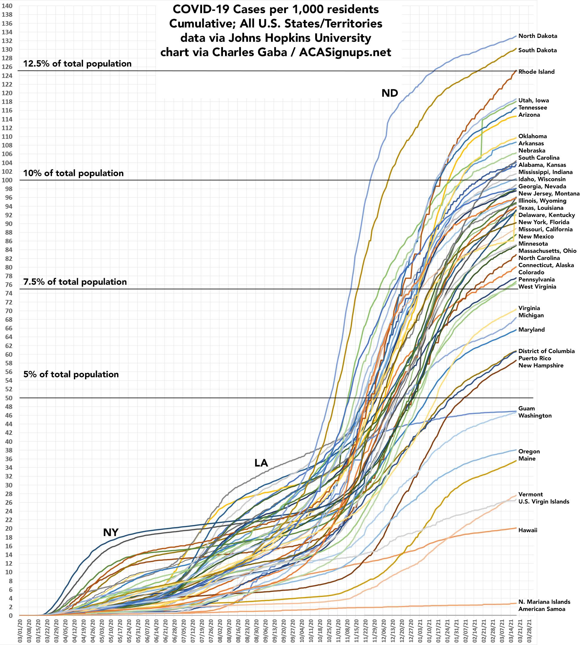 I've done my best to label every state/territory, which obviously isn't easy to do for most of them given how tangled it gets in the middle. For cases per capita, the most obvious point is that New York and New Jersey, which towered over every other state last spring, are now dwarfed by North & South Dakota, although things are pretty horrible nearly everywhere now.