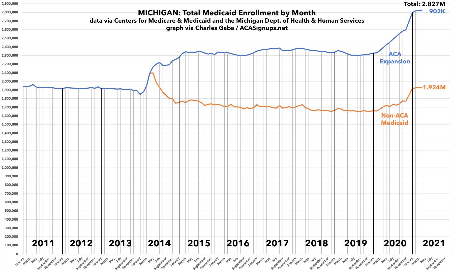 Michigan: Medicaid expansion enrollment up 34% since COVID hit; total Medicaid enrollment up 21%