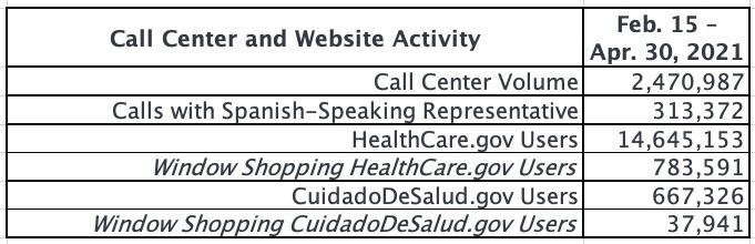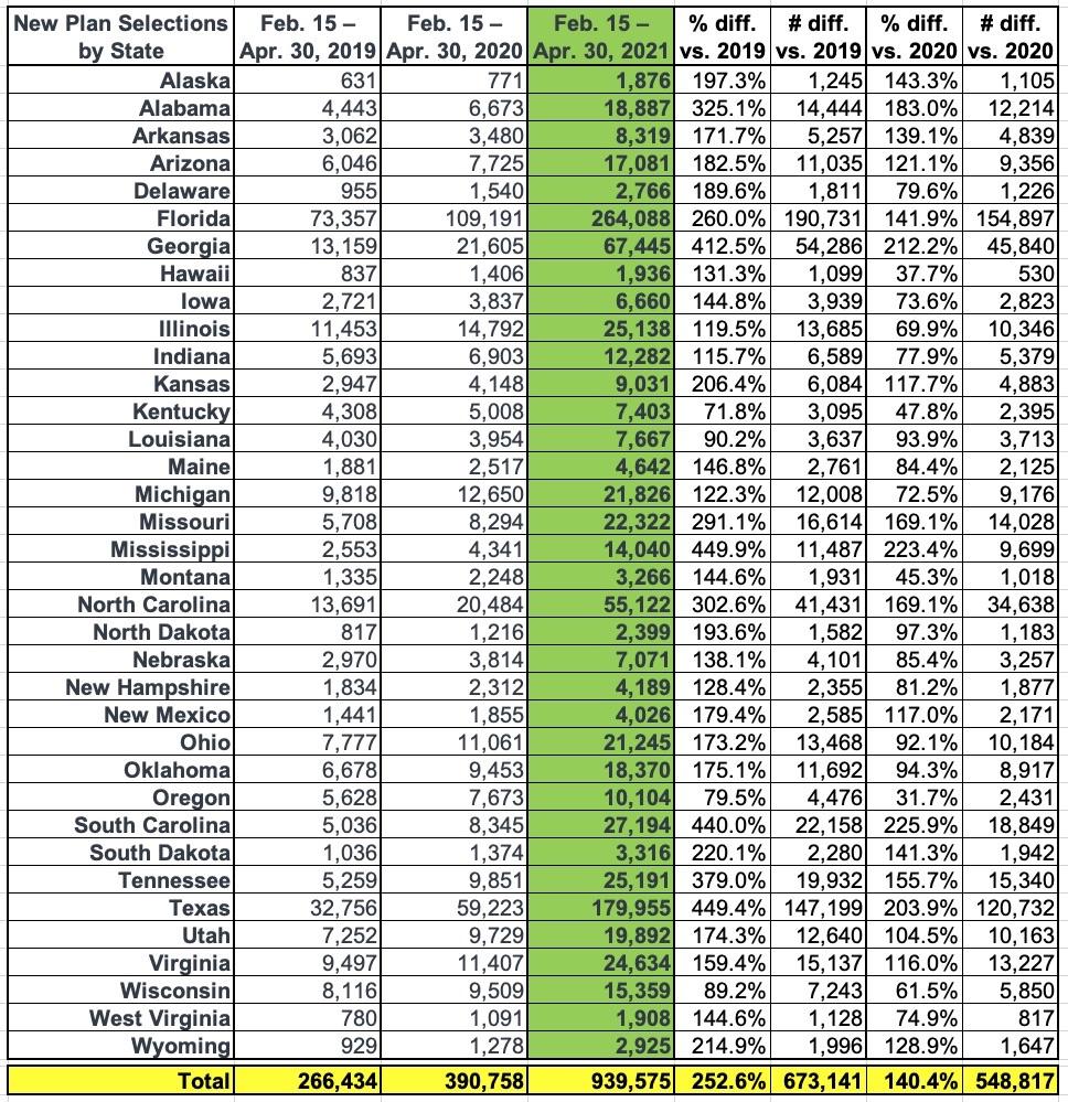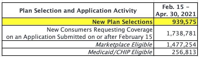 [1] Cumulative plan selections from February 15 through April 30 reflect new plan selections net of terminations and cancellations during that period and count consumers that were not actively enrolled as of February 14. The April 1-30, 2021 total only reflects plan selection activity since April 1 and counts consumers that were not actively enrolled as of March 31. The comparable figure for March 1-31, 2021 was 343,000.