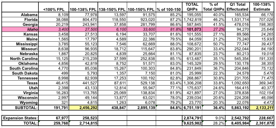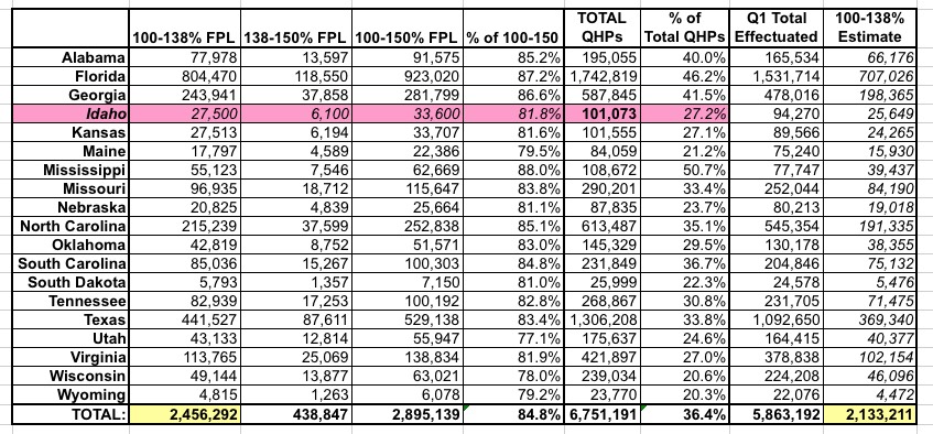In all, 2,687,315 people within the 100-138% range selected QHPs via HC.gov this year. 18 of the 19 non-expansion states are included, because Idaho runs their own full exchange. Subtracting out the states which did expand Medicaid leaves us with the following (I'll explain my estimate for Idaho below):