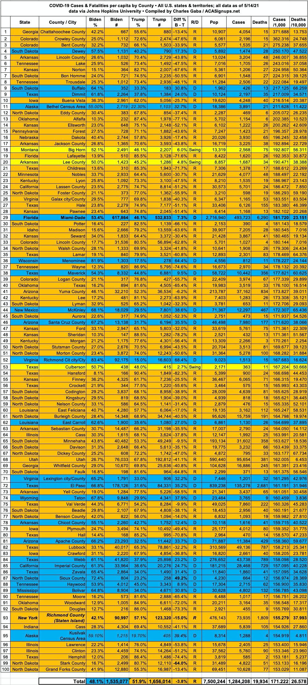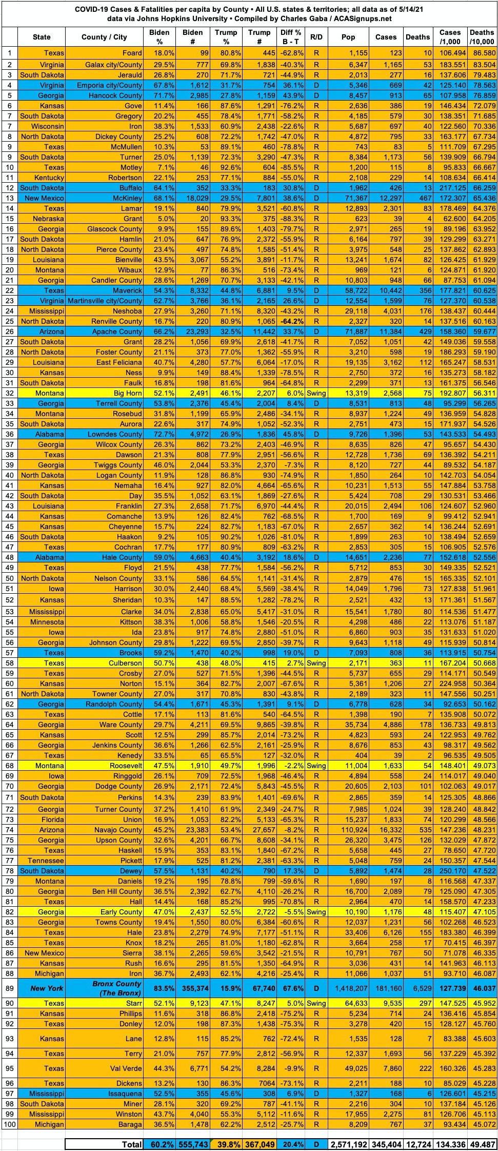 Here's the top 100 counties ranked by per capita COVID-19 fatalities as of Friday, May 14th, 2021 (click image for high-res version):