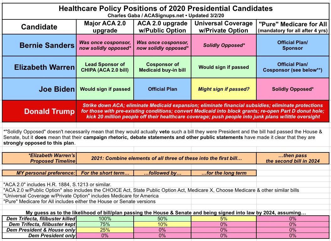 Since my earlier version of this analysis, I've simplified not only the list of candidates but also the types of plans--I've cut them down from eight specific bills/plans on the table down to four types of plans, each of which may include more than one specific bill. I've done my best to clarify which candidates either officially support, officially oppose or are open to supporting each. I've also thrown in my own preferred route forward for the heck of it. These break out into four main categories: