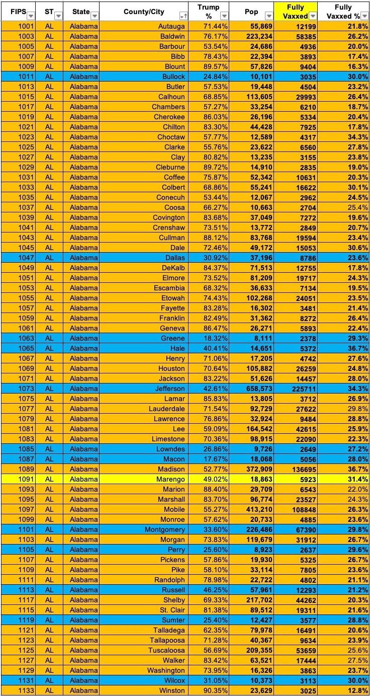 Updated: Alabama: #COVID19 vaccination rates by county & partisan lean
