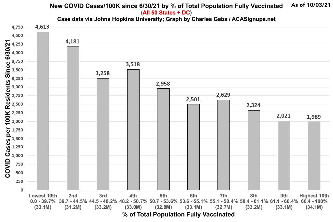 Sure enough, counties with the highest full vaccination rate (66% of the total population vaccinated or higher) have had less than half as many new cases reported per capita since June 30th than those which have vaccinated fewer than 40% of their residents.