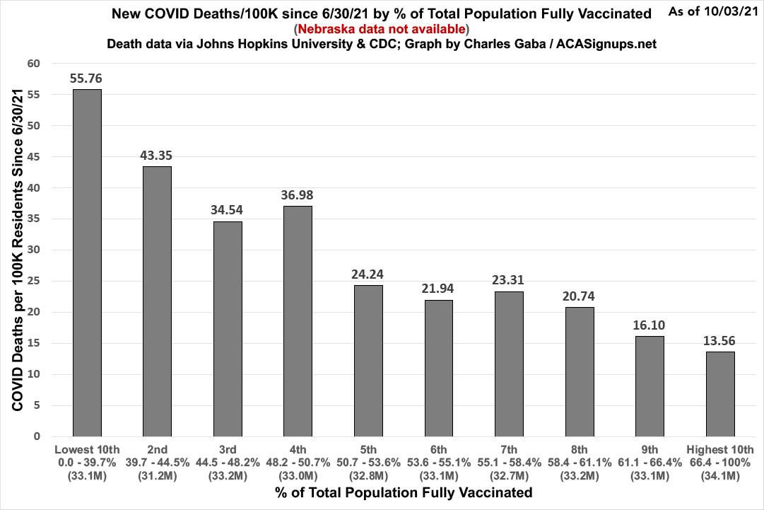 Finally, let's step back from the partisan angle for a moment and break the entire population out by vaccination rate to see whether that's reducing the COVID case and death rates: