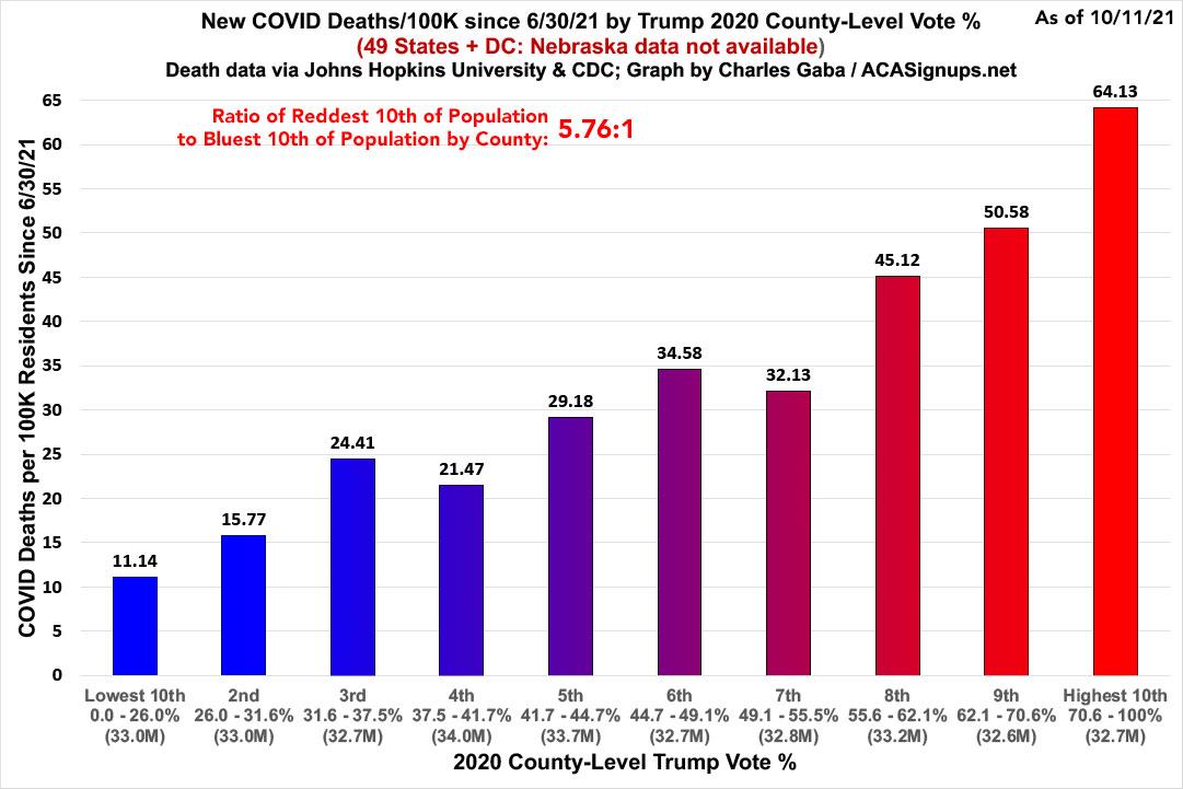 Since Delta began circulating widely in the U.S., Covid has exacted a horrific death toll on red America: In counties where Donald Trump received at least 70 percent of the vote, the virus has killed about 47 out of every 100,000 people since the end of June, according to Charles Gaba, a health care analyst. In counties where Trump won less than 32 percent of the vote, the number is about 10 out of 100,000.