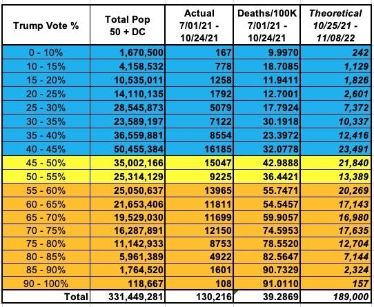 Well, here's what the COVID death rate looks like from 11/03/20 - 10/24/21 by Trump vote percent. The total population of all 50 states + DC has been broken out into 10 brackets of roughly 33.1 million people apiece (none are exactly that number, but all are within a few hundred thousand). In all, around 495,000 Americans have died of COVID since Election Day 2020 (plus several thousand whose county of residence is unknown, along with some in Puerto Rico and other U.S. territories not included here).