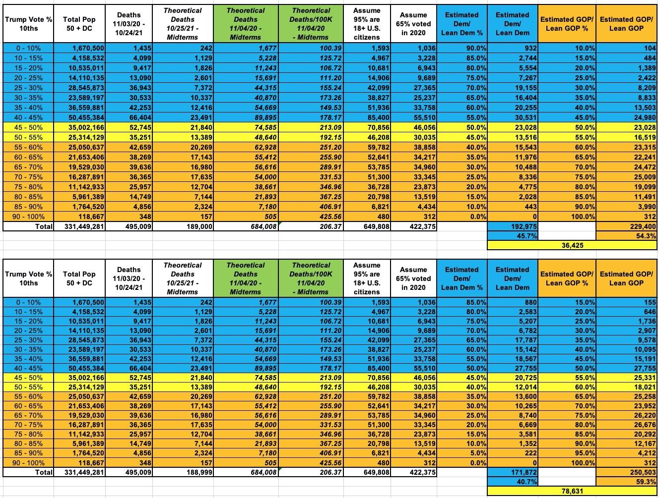 Assuming these are somewhere in the ballpark, it would mean that between 36,000 - 78,000 more Republican voters will have died of COVID since Election Day 2020 than Democrats by the midterms.