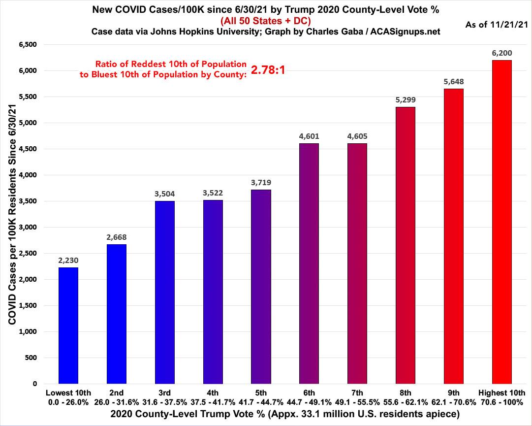 The ratio of case rates has started to drop; new cases are now running 2.78x higher per capita in the reddest tenth of the country than the bluest tenth, down from 3.0x higher a month ago: