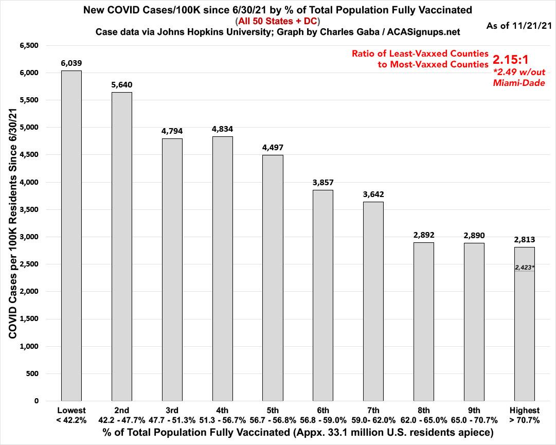 As you can see, case rates since June are 2.15x higher in the least-vaccinated tenth of the country than in the most-vaccinated tenth...slightly lower than a couple of weeks ago.
