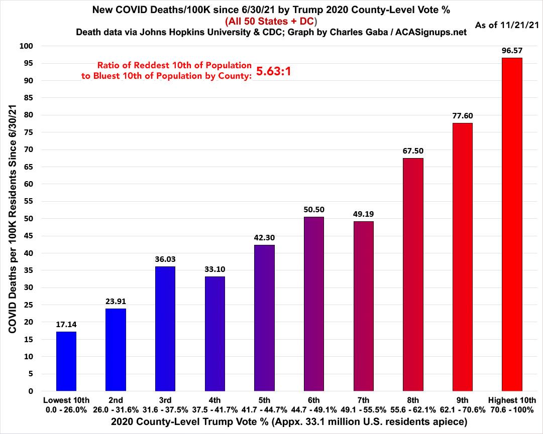 The ratio of death rates has also begun to shrink, with the rate in the reddest tenth now 5.63x higher than in the bluest tenth, down from 6.0x higher a month ago: