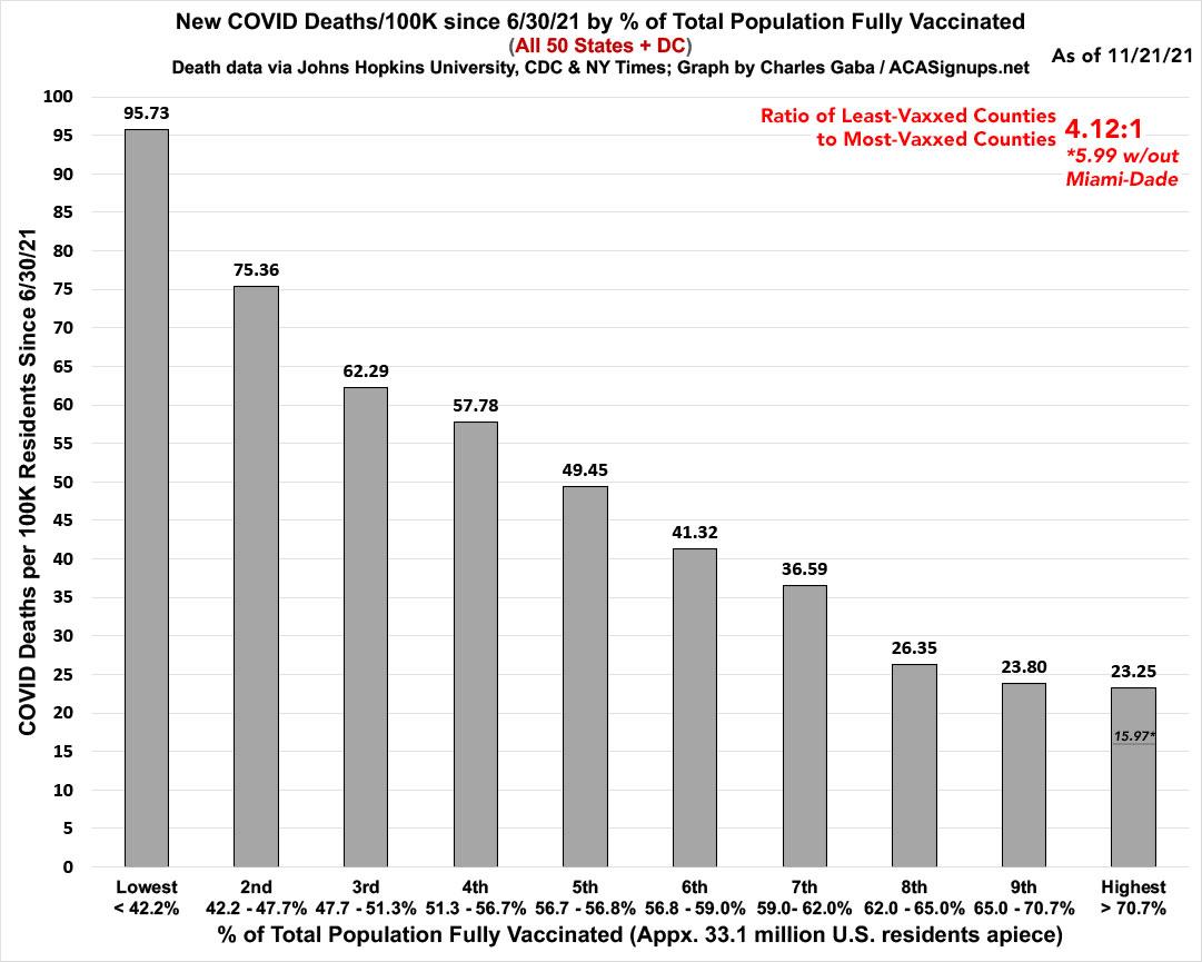 Note: As I explained in a recent blog post, Miami-Dade County is a massive outlier when it comes to the relationship of cases/deaths to the official vaccination rate, and I strongly suspect this is due to a substantially high incidence of "vaccine tourism" combined with the "snowbird" effect. As such, I've started also breaking out what the most-vaccinated tier would look like in terms fo both case & death rates if Miami-Dade County was disregarded. As you can see, it's pretty dramatic in both cases: