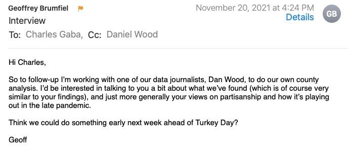 HOWEVER, when you contact a fellow data analyst specifically because they're working on the same data, then request a lengthy meeting with them in order to speak with them about their work and their methodology, and then follow up with them in order to schedule a second lengthy meeting to discuss the same work again, and then follow up with them a third time to clarify other details, it's generally considered professional to mention them at least once in the final piece you publish on your far higher-profile platform.