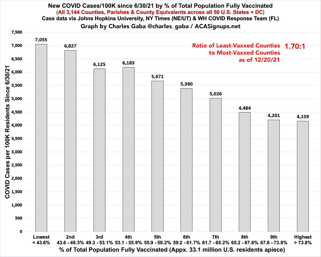 Note: As I explained in a recent blog post, Miami-Dade County, officially part of the "most-vaccinated bracket," is a massive outlier when it comes to the relationship of cases/deaths to the official vaccination rate, and I strongly suspect this is due to a substantially high incidence of "vaccine tourism" combined with the "snowbird" effect. It therefore likely belongs in the 7th or 8th brackets instead & both the case & death rates in the 10th bracket are likely a bit lower still than the official data would indicate.