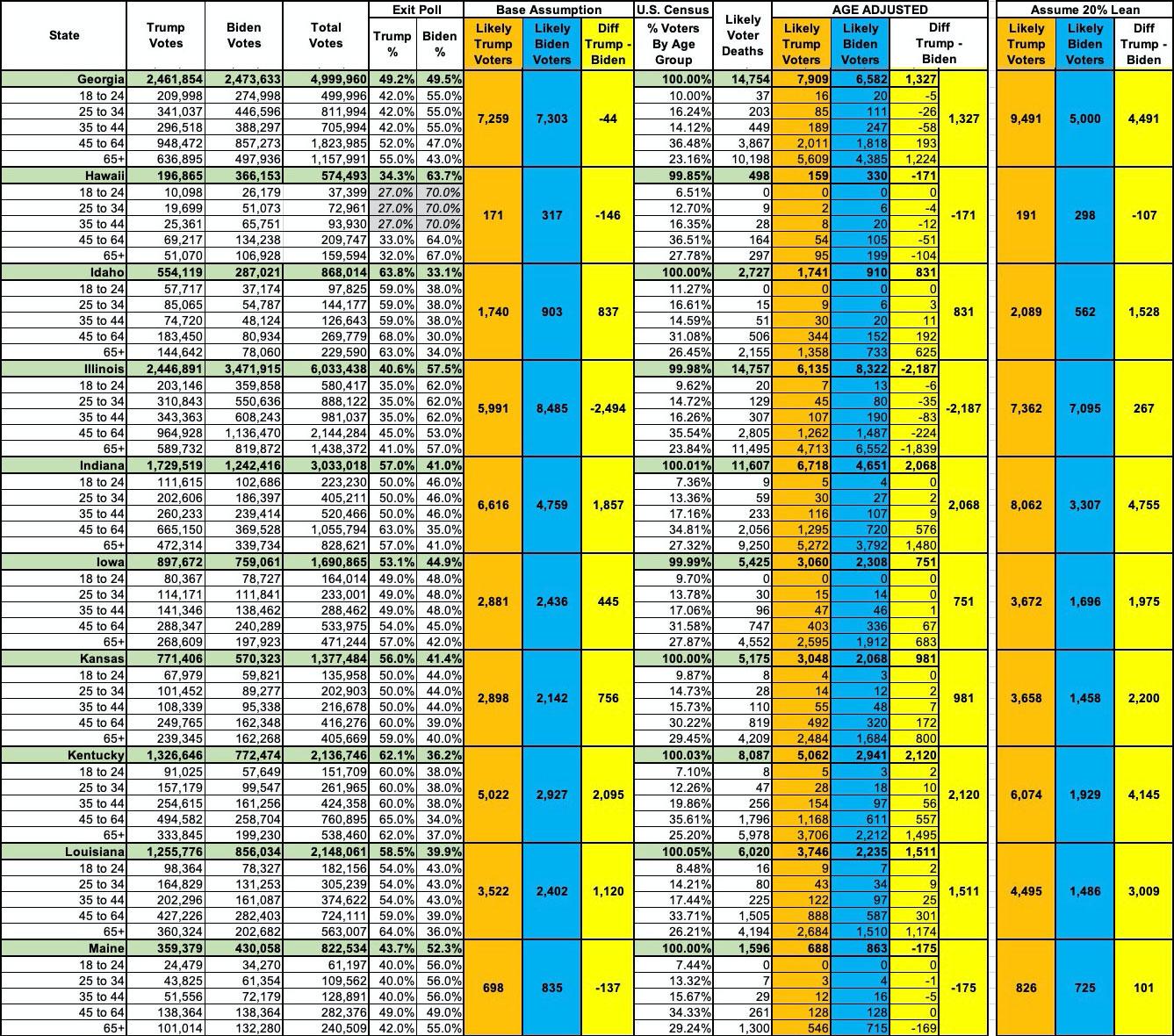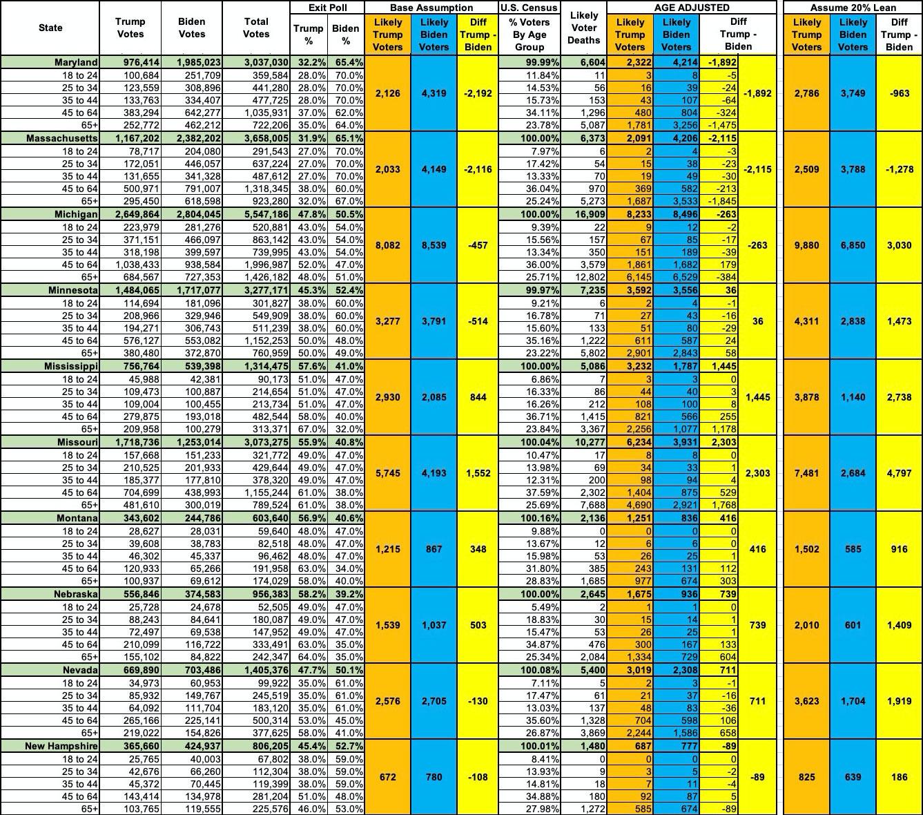 • Finally, the "Assume 20% Lean" columns attempt to account for the other factors I mentioned earlier: Misreported COVID deaths by MAGA coroners, the impact of refusal to wear masks/socially distance and so forth. Assuming this is reasonably accurate, it adds up to around 118,000 more Trump voters (roughly a 135,000 swing from popular vote expection).