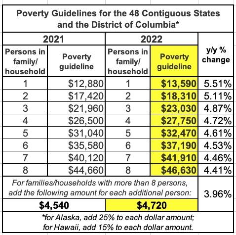 As required by law, this update is accomplished by increasing the latest published Census Bureau poverty thresholds by the relevant percentage change in the Consumer Price Index for All Urban Consumers (CPI-U). The guidelines in this 2022 notice reflect the 4.7 percent price increase between calendar years 2020 and 2021.